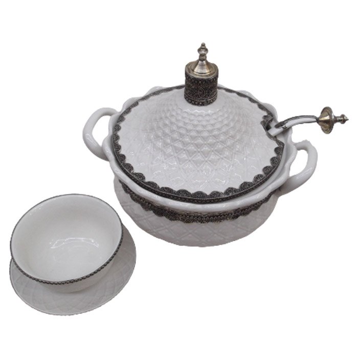 Service potage en métale argenté et argile blanc se compose de 6bols